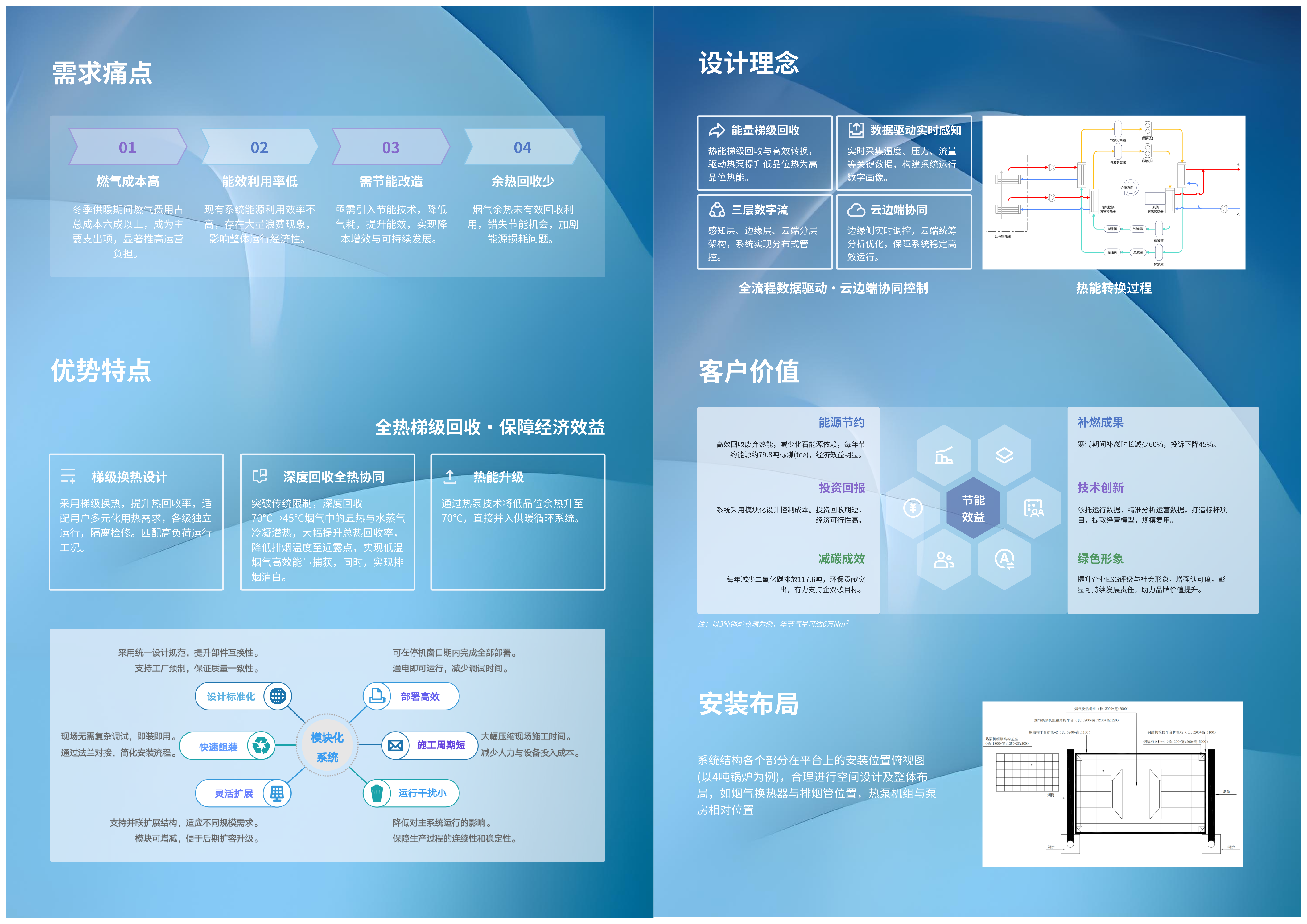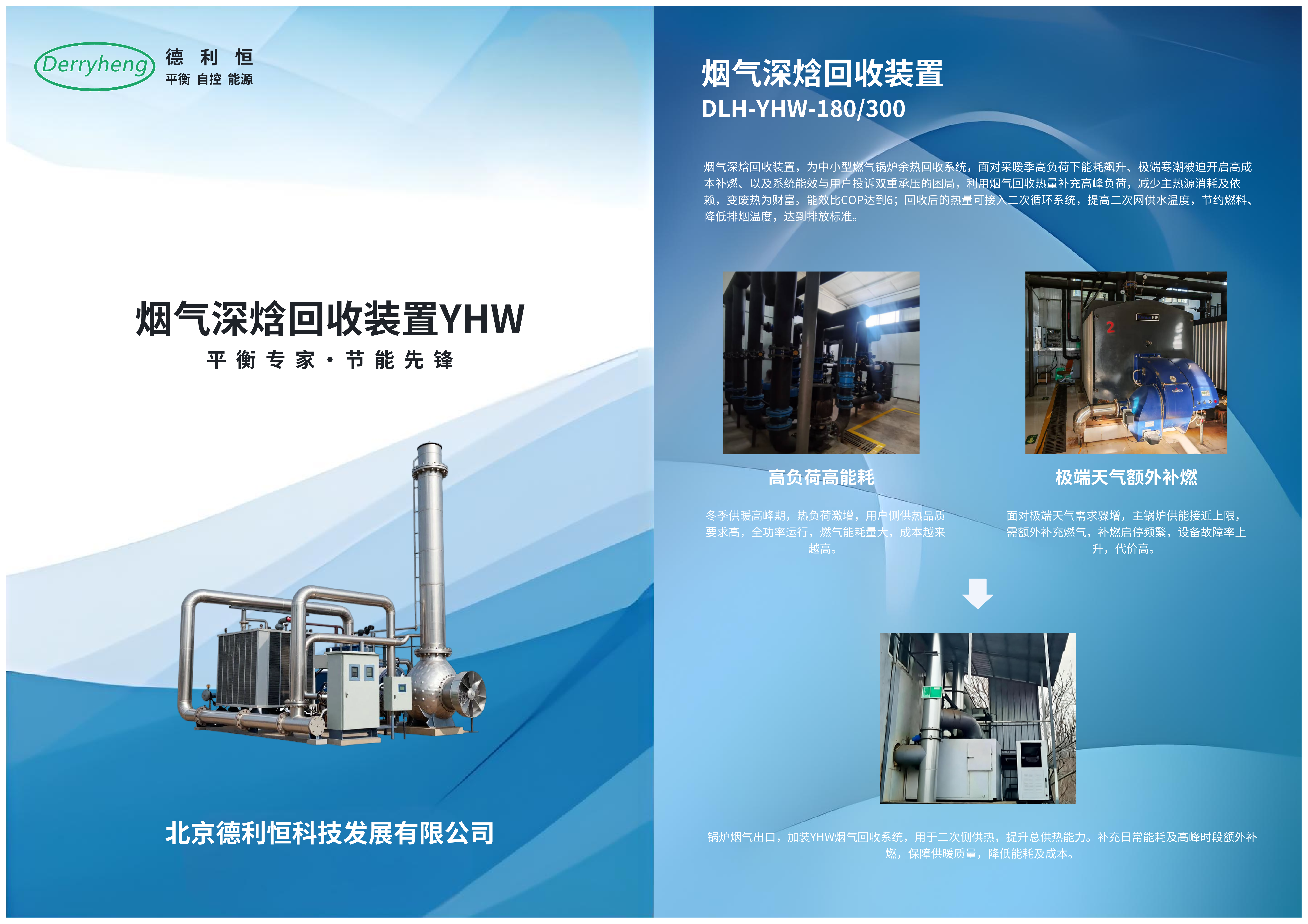为中小型燃气锅炉余热回收系统,面对采暖季高负荷下能耗飙升、极端寒潮被迫开启高成本补燃、以及系统能效与用户投诉双重承压的困局,利用烟气回收热量补充高峰负荷,减少主热源消耗及依赖,变废热为财富。能效比COP达到6;回收后的热量可接入二次循环系统,提高二次网供水温度,节约燃料、降低排烟温度,达到排放标准。